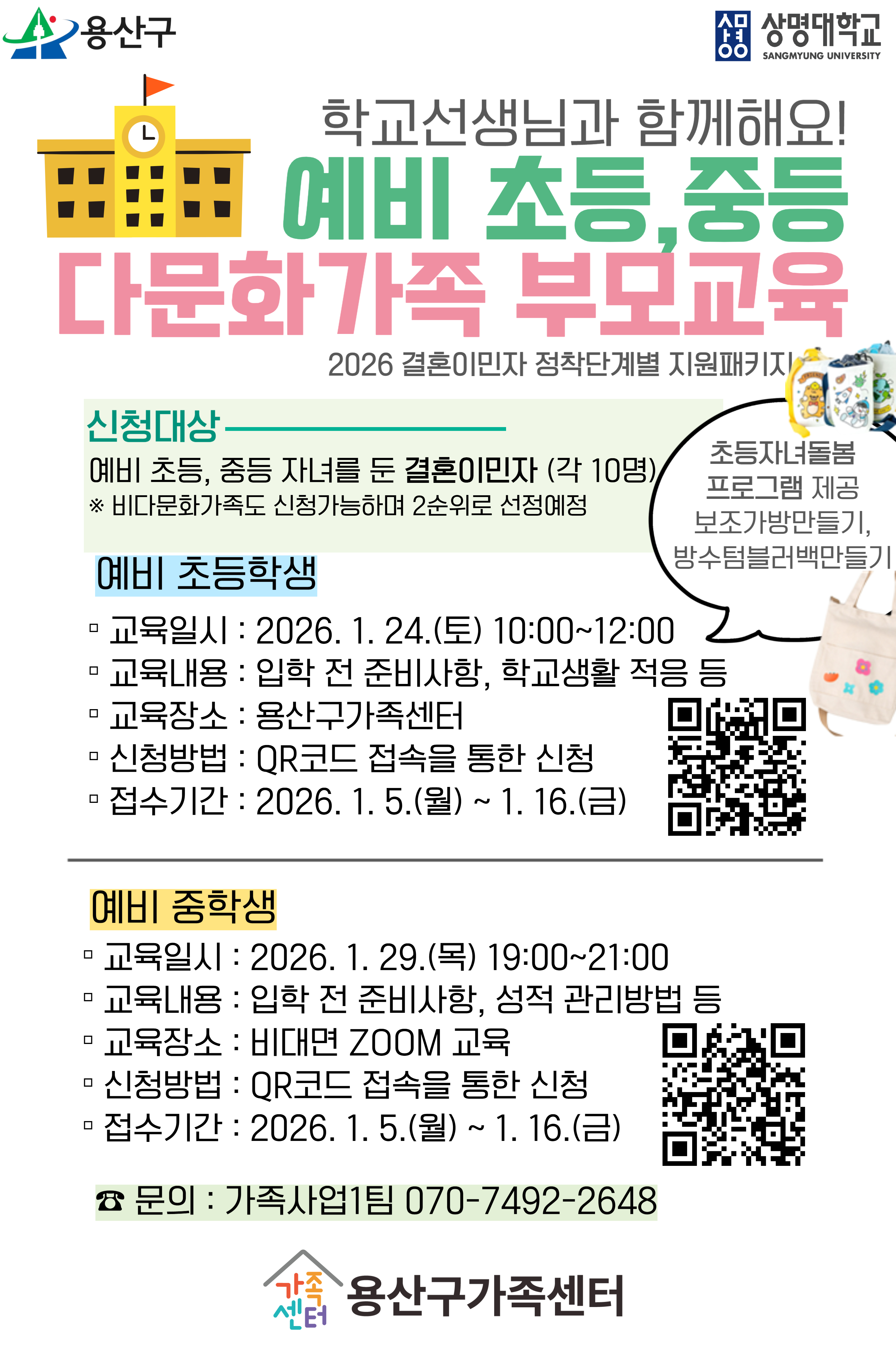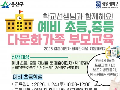 - 용산구[용산구] 학교선생님과함께해요! 예비 초등,중등 다문화가족 부모교육 신청접수중