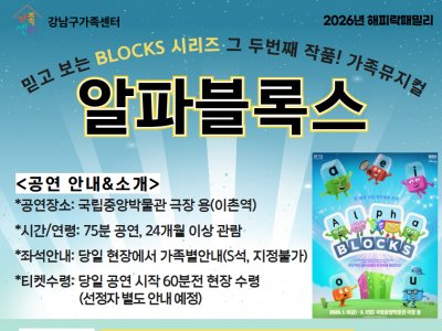 강남구가족센터 2026년 해피락패밀리. 세번째 가족 뮤지컬 <알파블록스> 관람가족을 모집합니다.