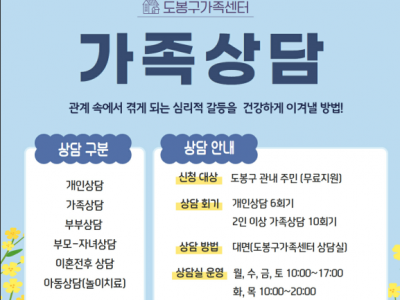 도봉구 가족센터에서는 관계속에서 겪게되는 심리적 갈등을 건강하게 이겨내시는데 도움이 되고자 개인상담과 2인 이상의 가족상담을 진행하오니 많은 관심과 참여 바랍니다.