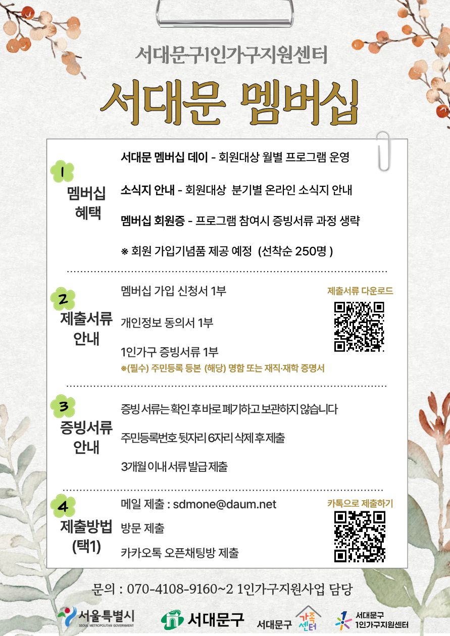 “서대문 멤버십 회원제”는 서울생활권 1인가구면 누구나 가입가능하며,