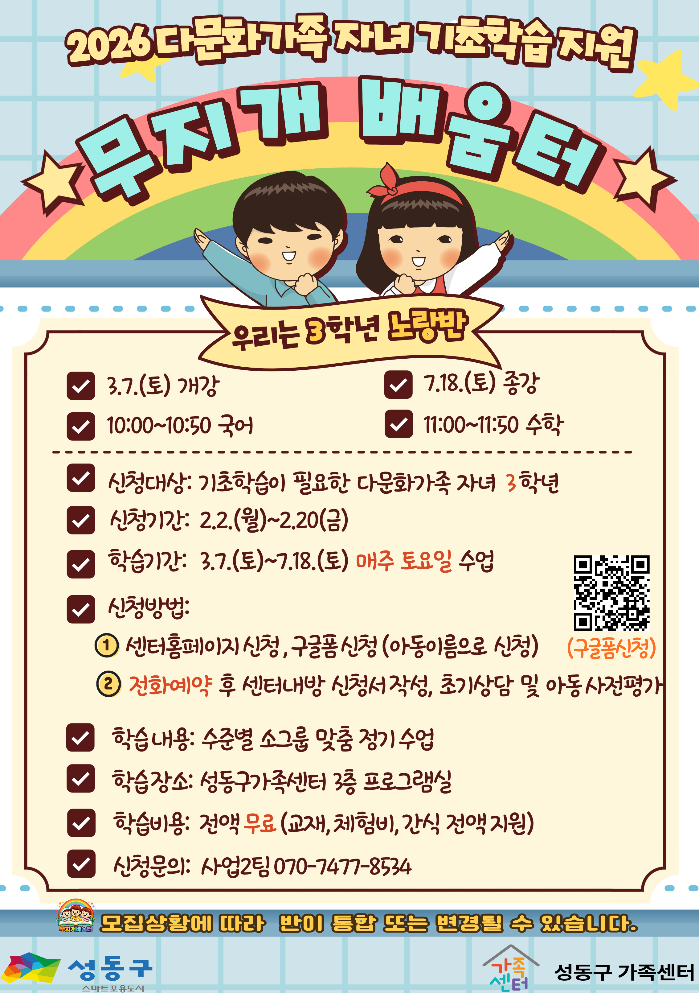 - 성동구[성동구] 2026 다문화가족 자녀 기초학습지원 국어, 수학 3학년 토요일반 모집중