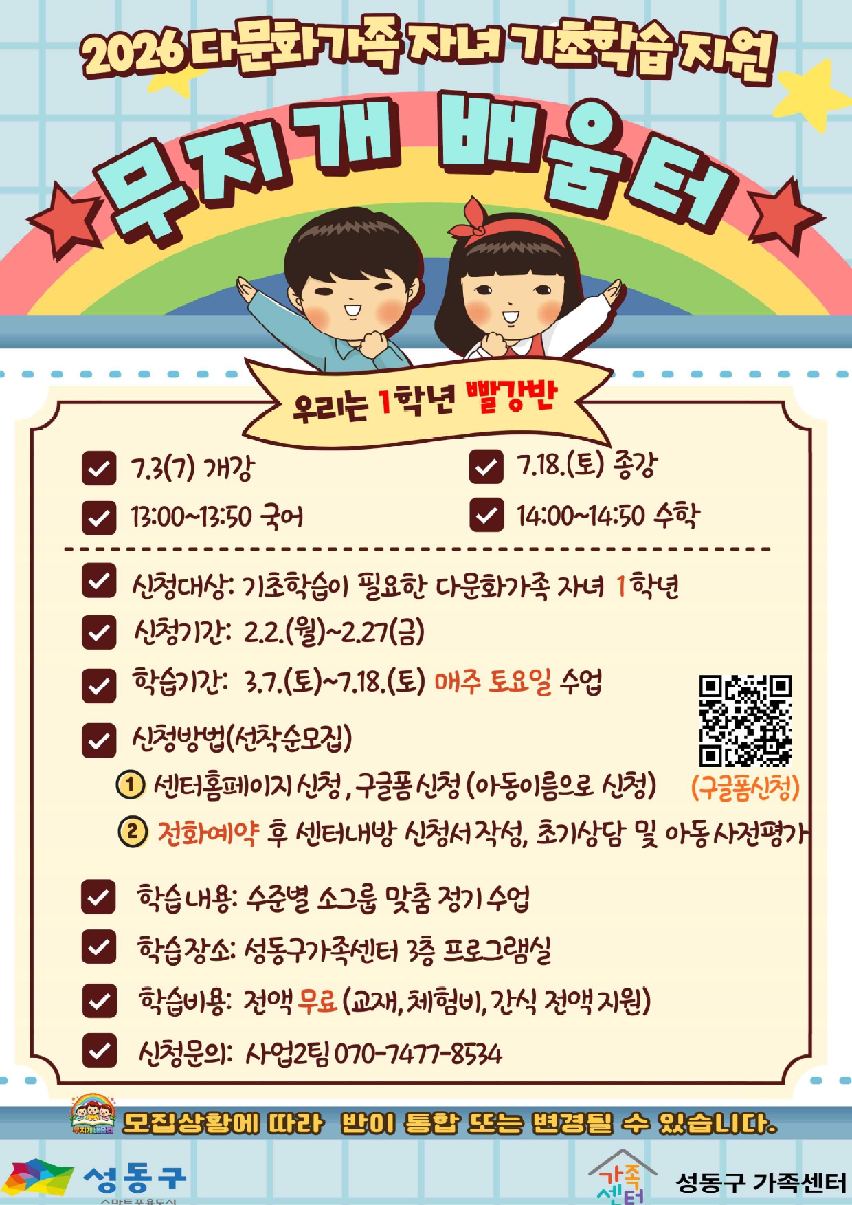 다문화가족 자녀 기초학습 지원을 위해 무지개 배움터가 3월부터 개강됩니다.국어와 수학 기초학습이 부족한 초등학교 1학년 학생들 많이 많이 지원해주세요.