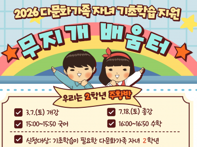 다문화가족 자녀 기초학습 지원을 위해 무지개 배움터가 3월부터 개강됩니다.국어와 수학 기초학습이 부족한 초등학교 2학년 학생들 많이 많이 지원해주세요.