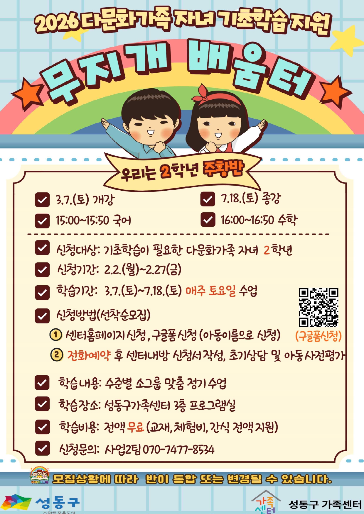 - 성동구[성동구]2026 다문화가족 자녀 기초학습지원 국어,수학 2학년 토요일반 신청접수중