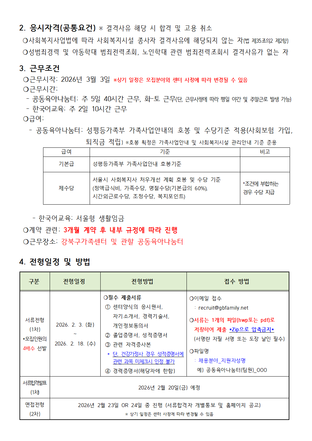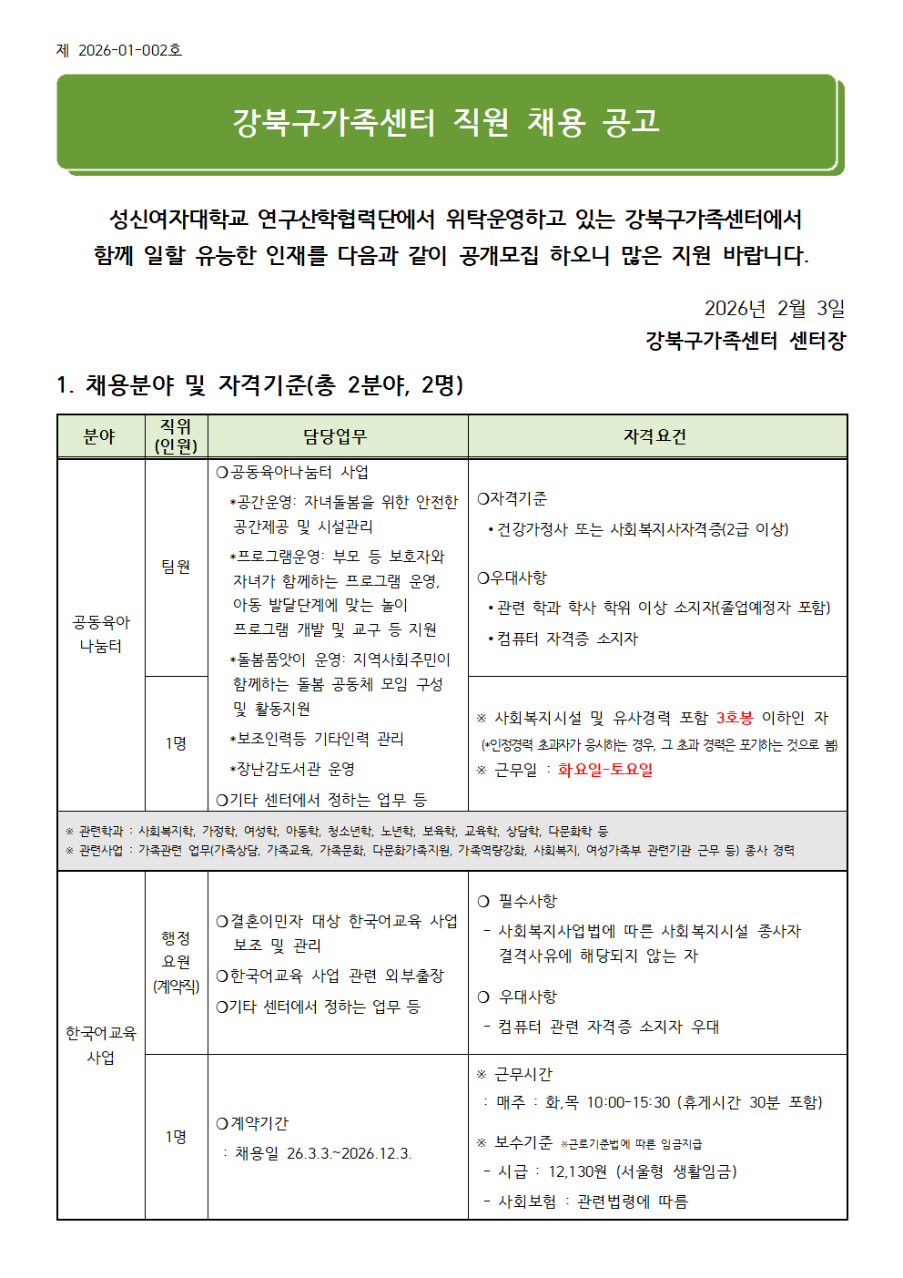(제2026-01-002호) 2026년 강북구가족센터 직원 채용 공고