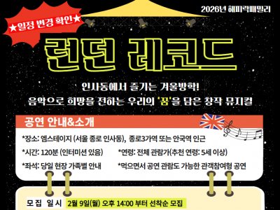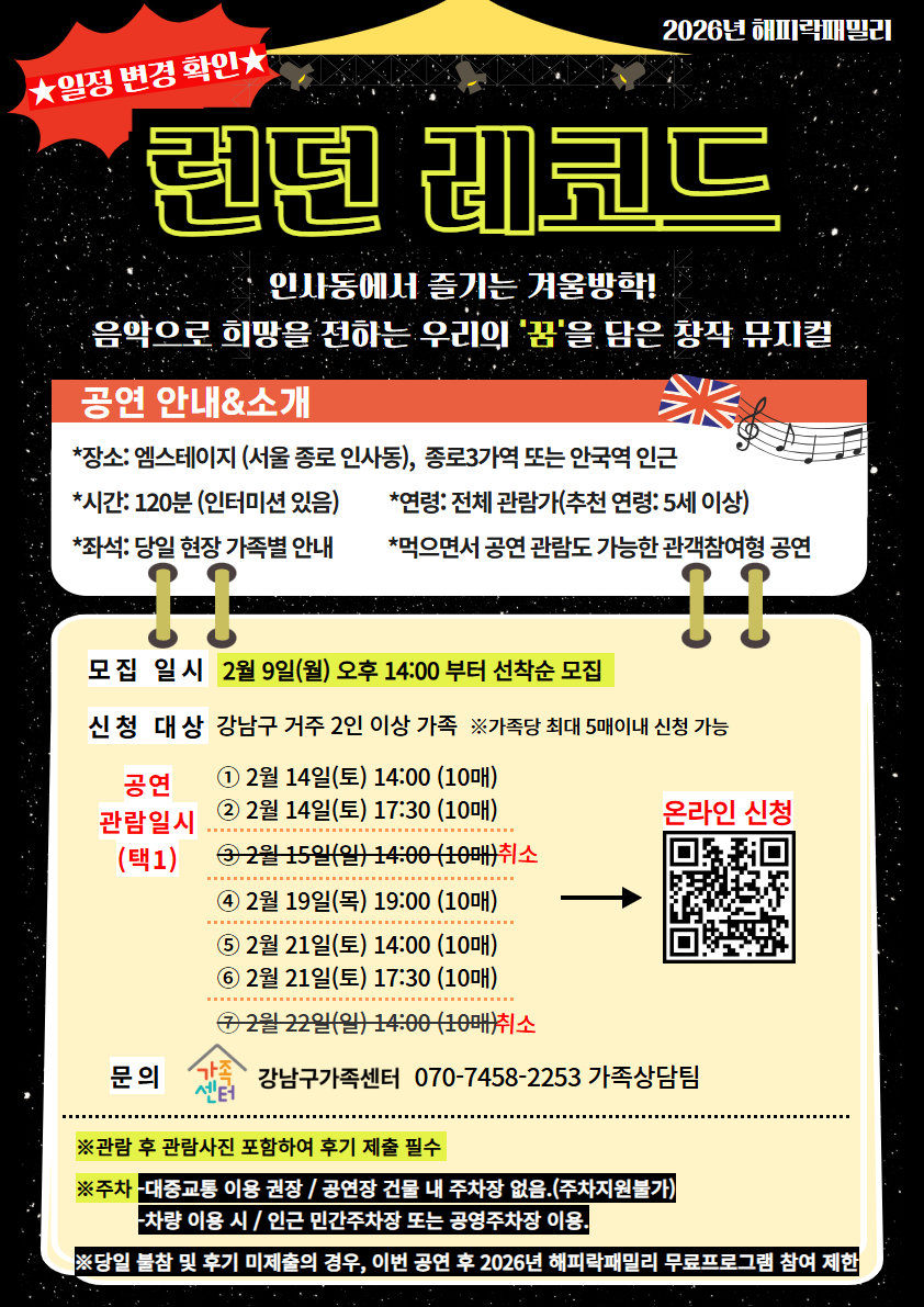 강남구가족센터 2026년 해피락패밀리. 네번째 가족 뮤지컬 <런던레코드> 관람가족을 모집합니다.