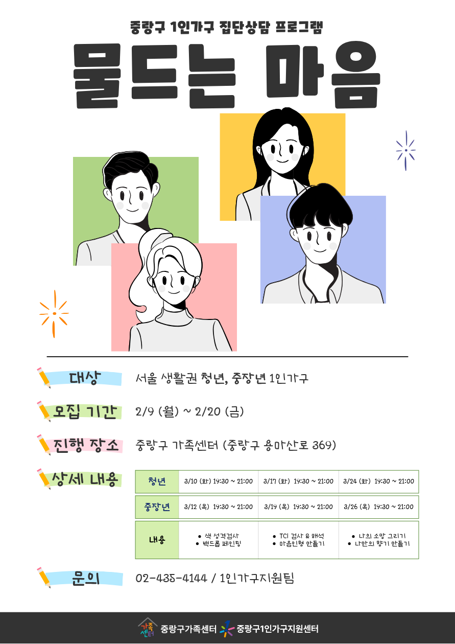 1인가구 집단상담 프로그램 '물드는 마음' 참여자를 모집합니다!