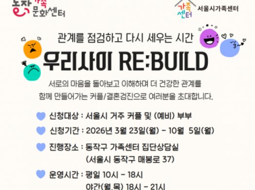 - 서울시 권역 부부 및 가족 2인 이상 동작구 가족센터 6층 가족상담실(서울 동작구 매봉로 37)
