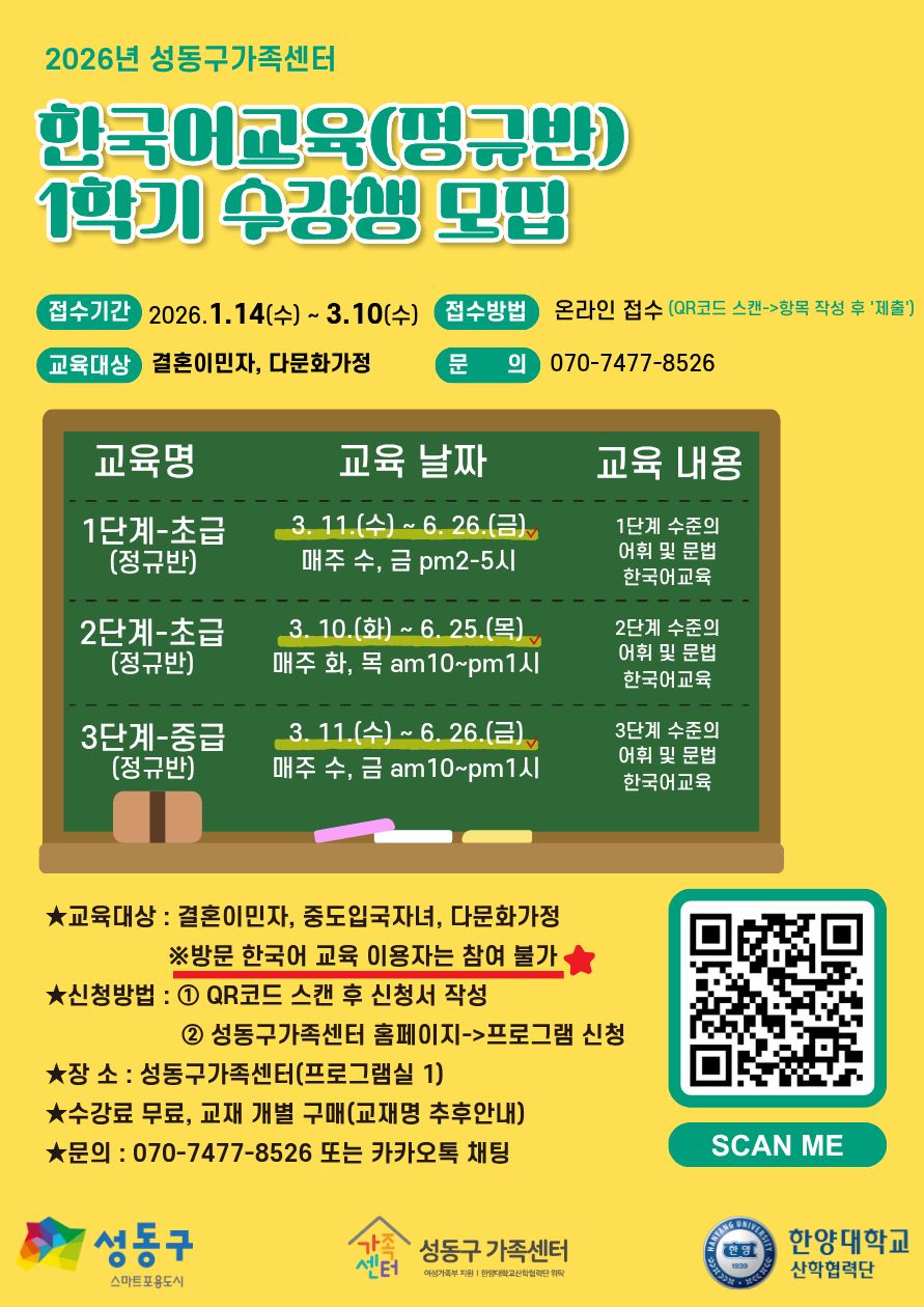 2026년 성동구가족센터 한국어교육 정규반 수강생 추가모집