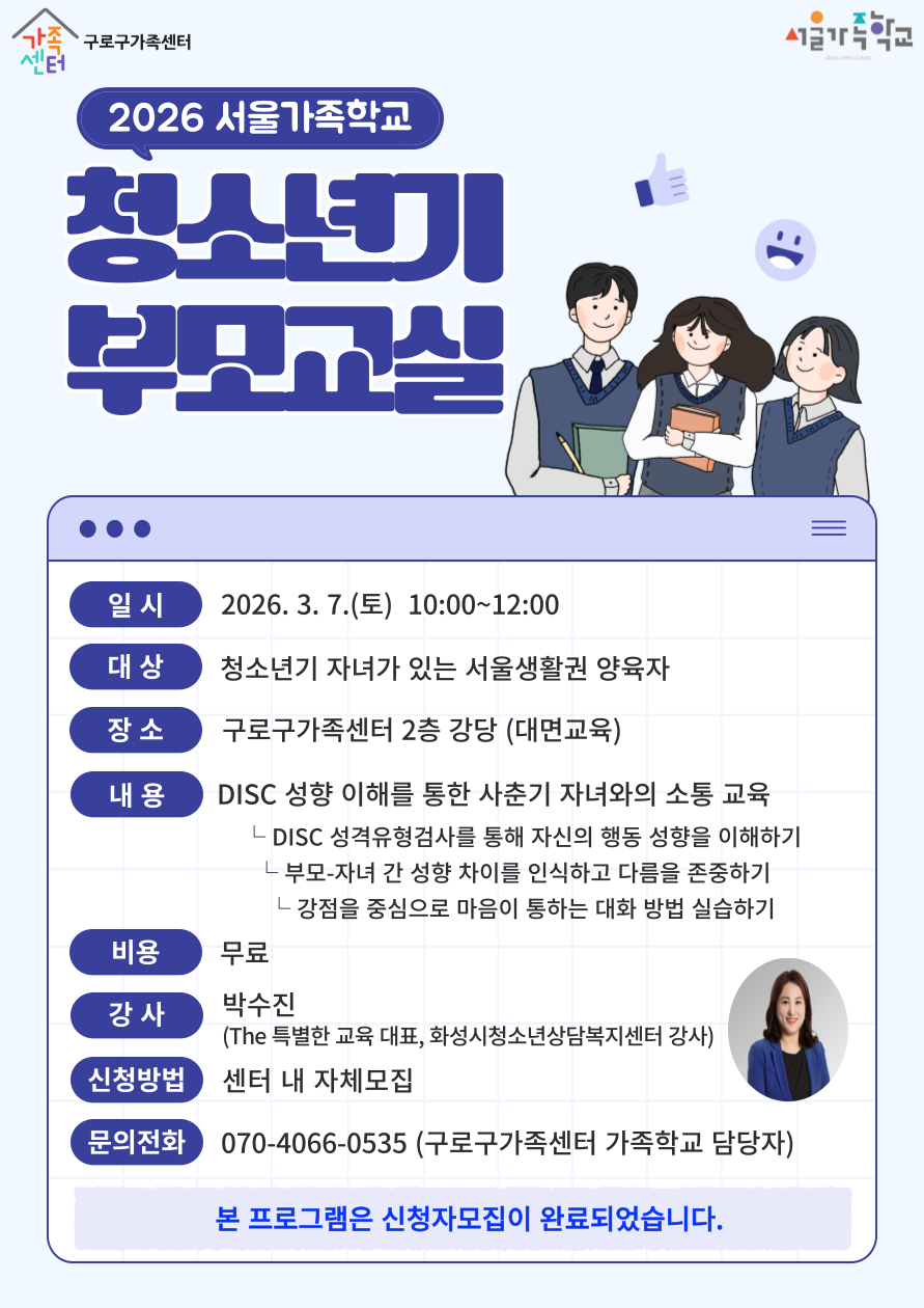 - 청소년기(10~19세)자녀 양육자 구로구가족센터 2층 강당