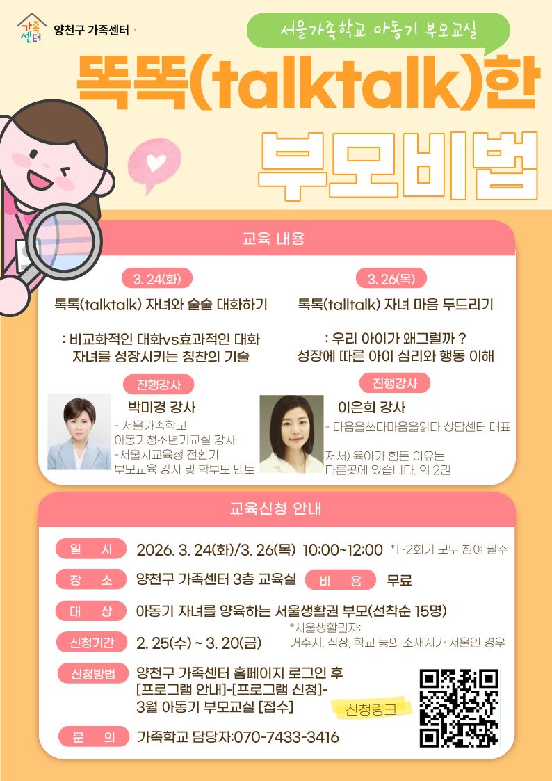 신청방법: 양천구 가족센터 홈페이지 로그인 후 [프로그램 안내-[프로그램 신청]-3월 아동기 부모교실 접수