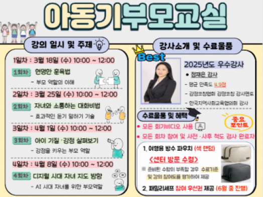 - 2회기: 3월 25일(수) 10:00~12:00, 자녀와 소통하는 대화비법
