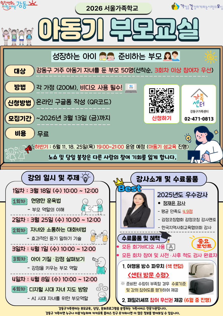 - 강동구[강동구] 서울가족학교 상반기 아동기부모교실 참여자 모집 (~3/13(금)까지)