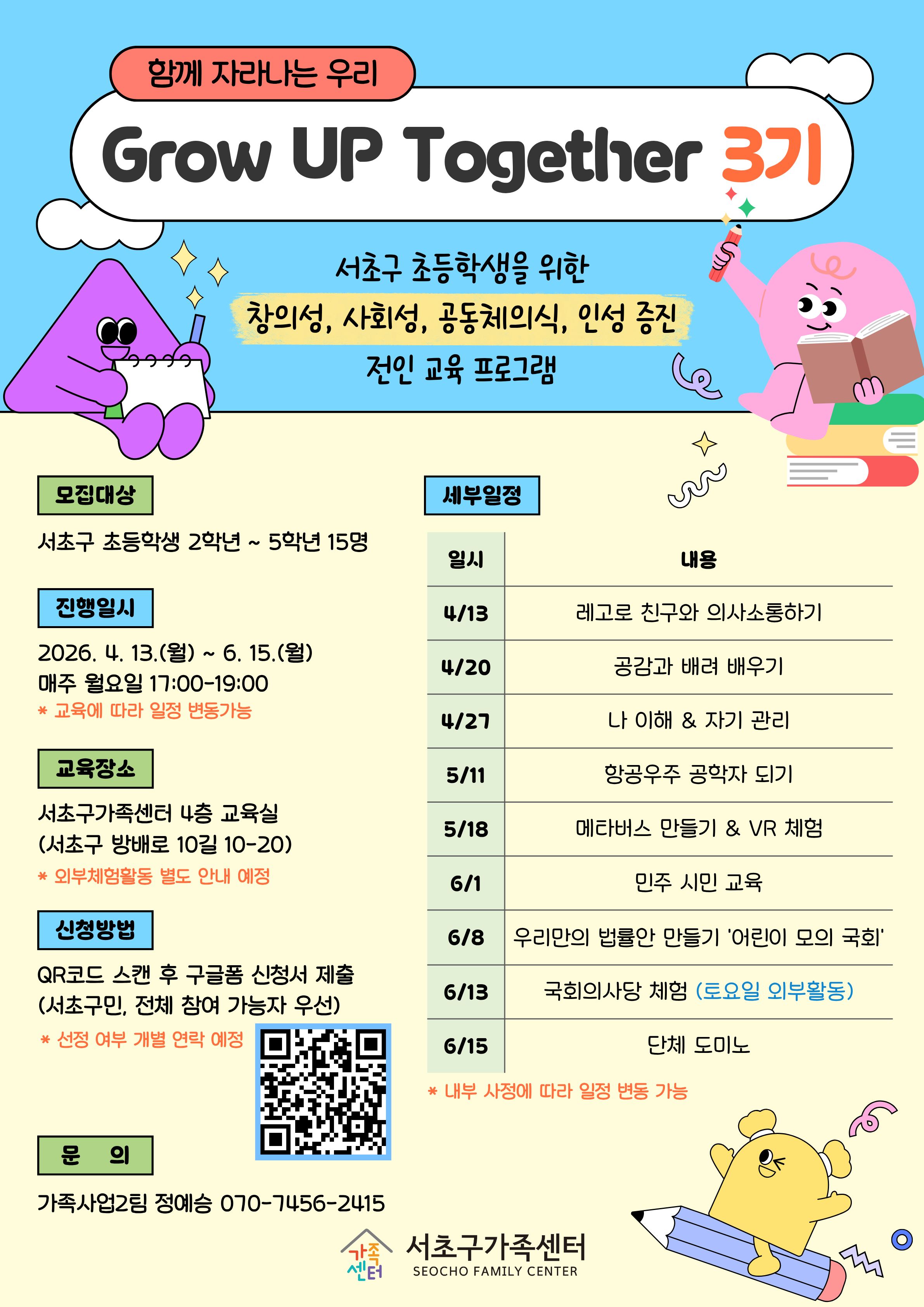 미래 인재로 성장할 수 있도록 돕는 초등 사회성·인성·창의성 프로그램 ‘Grow UP Together’ 3기를 모집합니다.