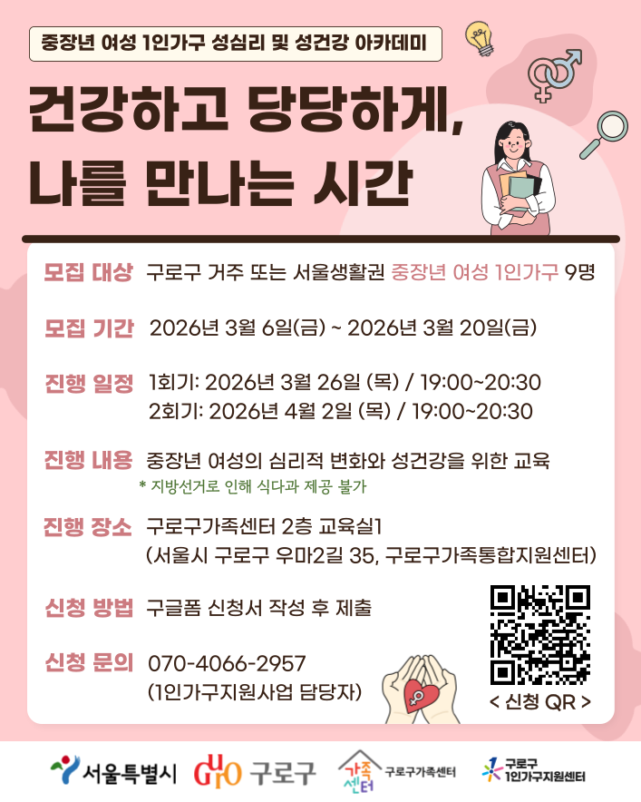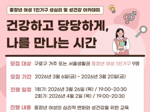 구로구가족센터(1인가구센터)에서는 중장년 여성 1인가구를 위한 성심리 및 건강 교육 참여자를 모집합니다.