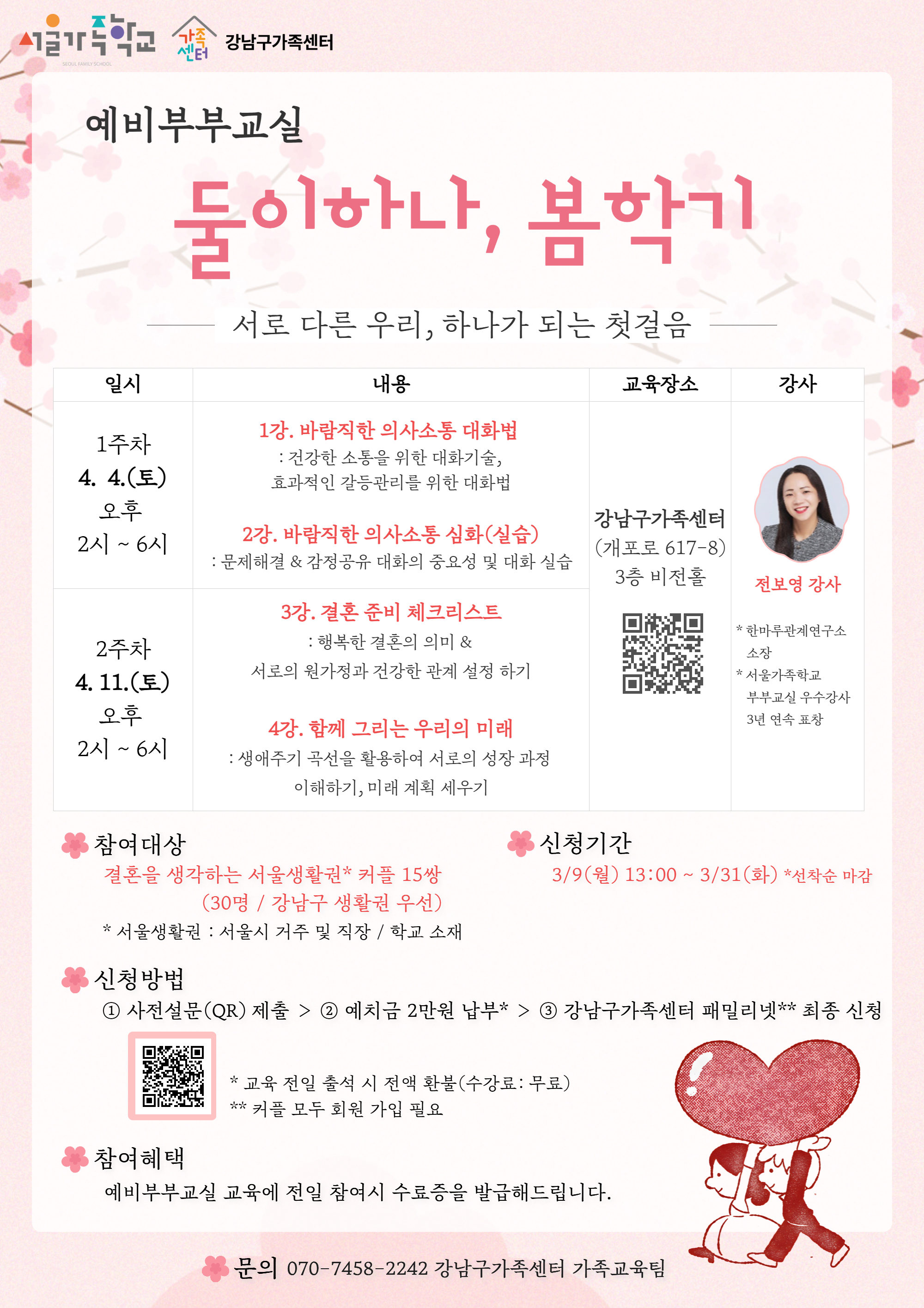 - 문의: 070-7458-2242 강남구가족센터 예비부부교실 담당자