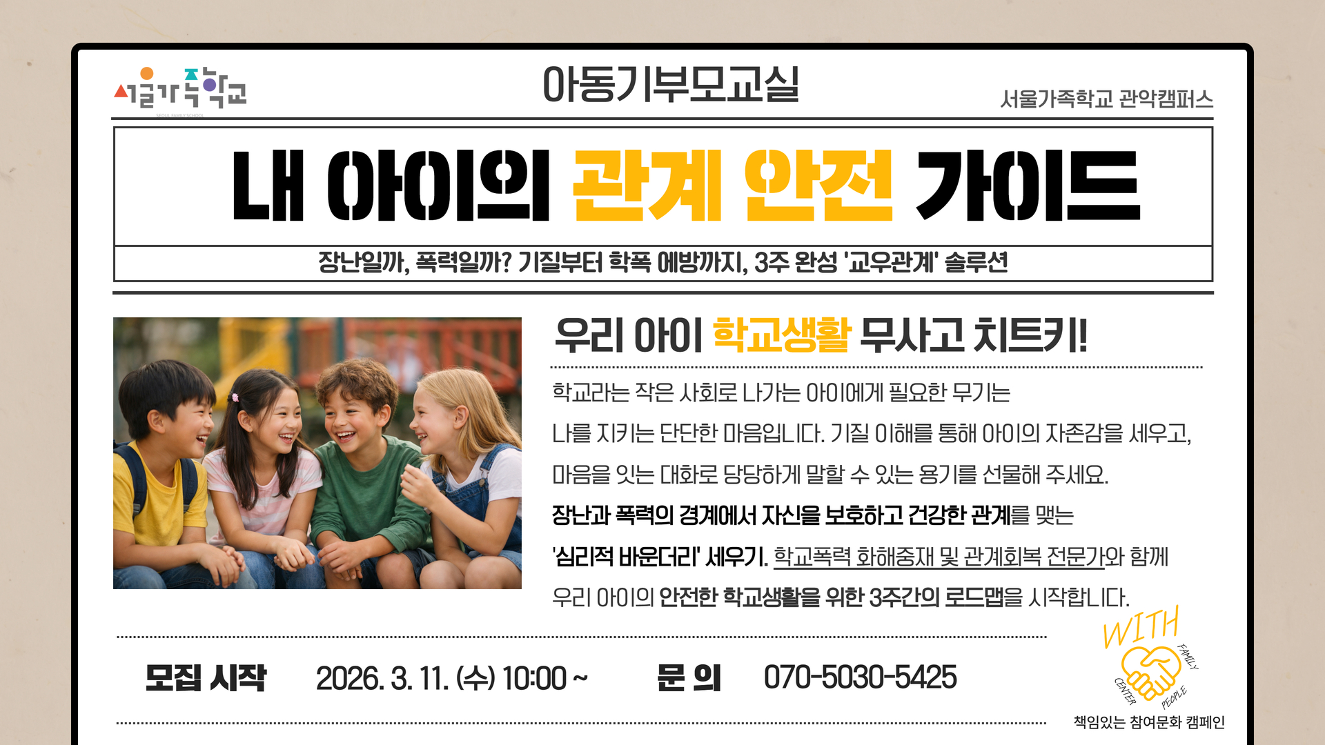 ์์ด๋ค์ด ๊ฑด๊ฐํ ๊ด๊ณ๋ฅผ ๋งบ๊ณ ์์ ์ ์งํฌ ์ ์๋๋ก ๋๊ธฐ ์ํด ์์ธ๊ฐ์กฑํ๊ต ๊ด์ ์บ ํผ์ค์์