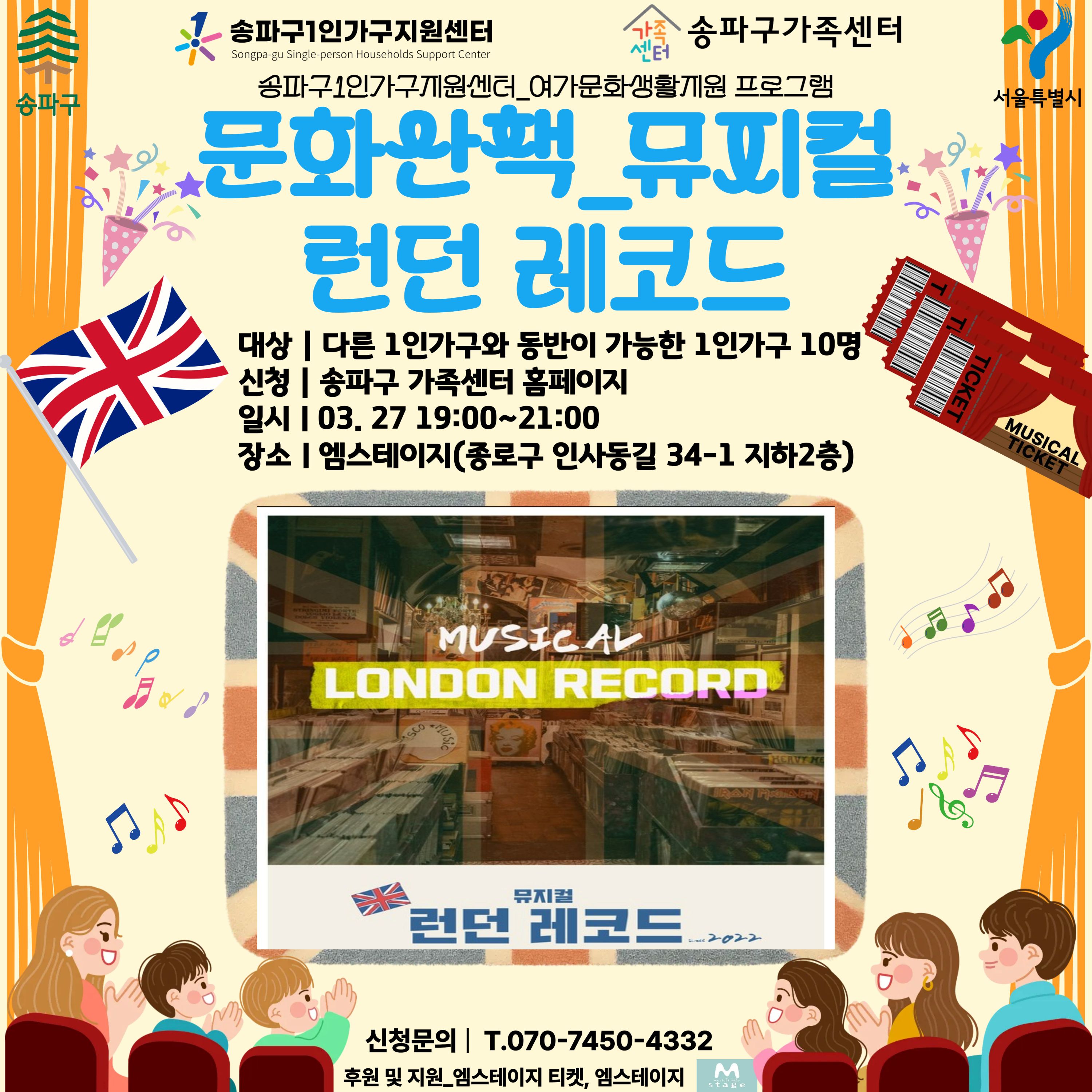 송파구 1인가구 지원센터에서 1인가구의 여가문화생활을 무료로 지원하여 뮤지컬 런던레코드 티켓을 지급하오니