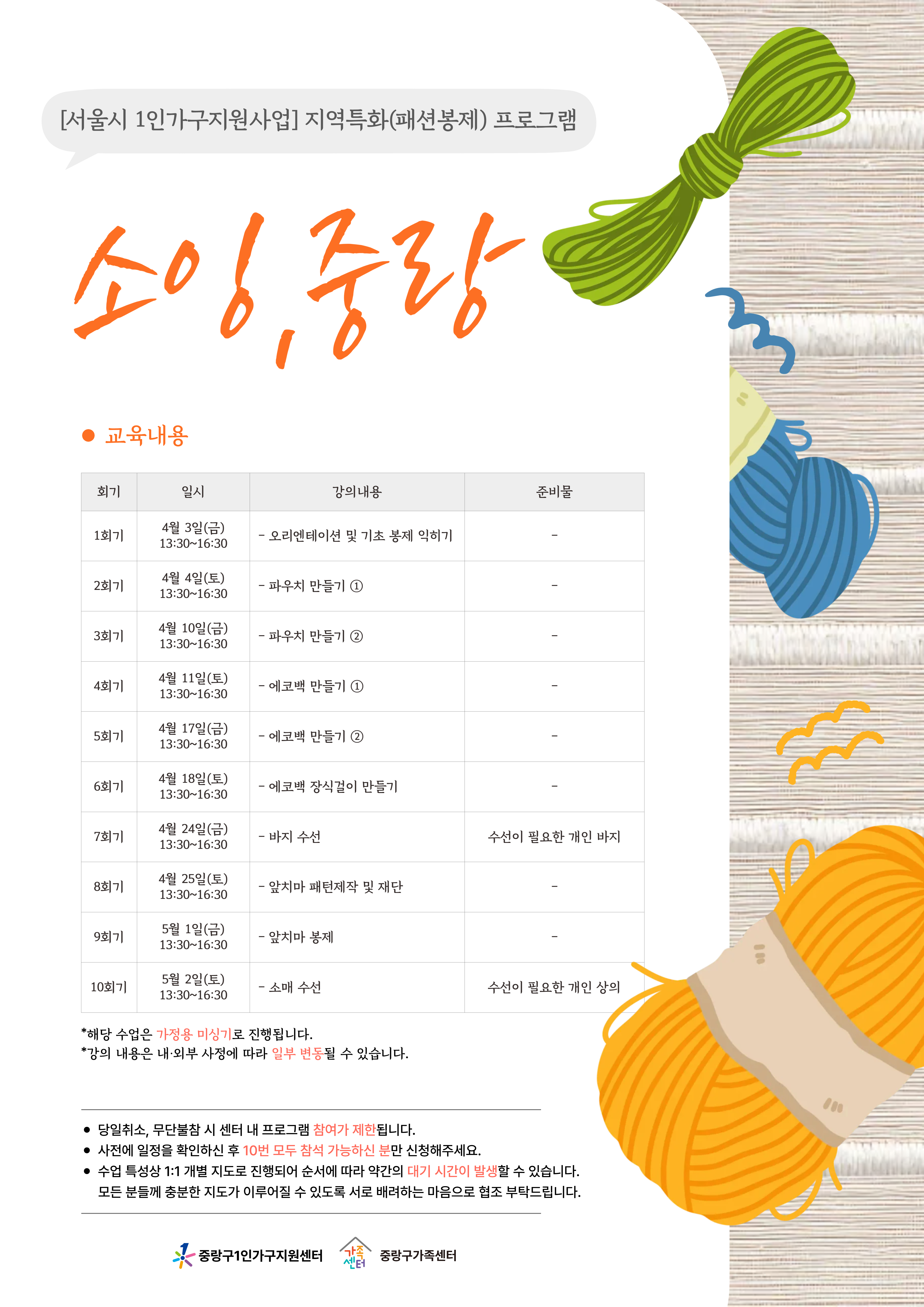 1인가구 봉제 프로그램 「소잉 중랑」참여자를 모집합니다.