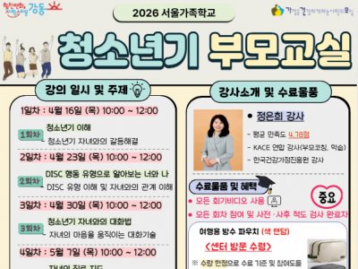 2026년 서울가족학교 청소년기부모교실 참여자를 모집합니다.