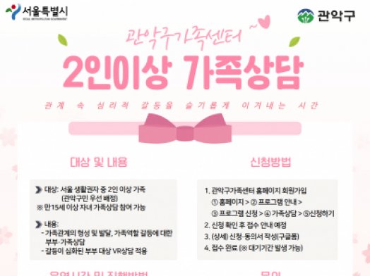 - 서울 생활권자 중 2인 이상 가족(관악구민 우선 배정) 관악구가족센터 상담실