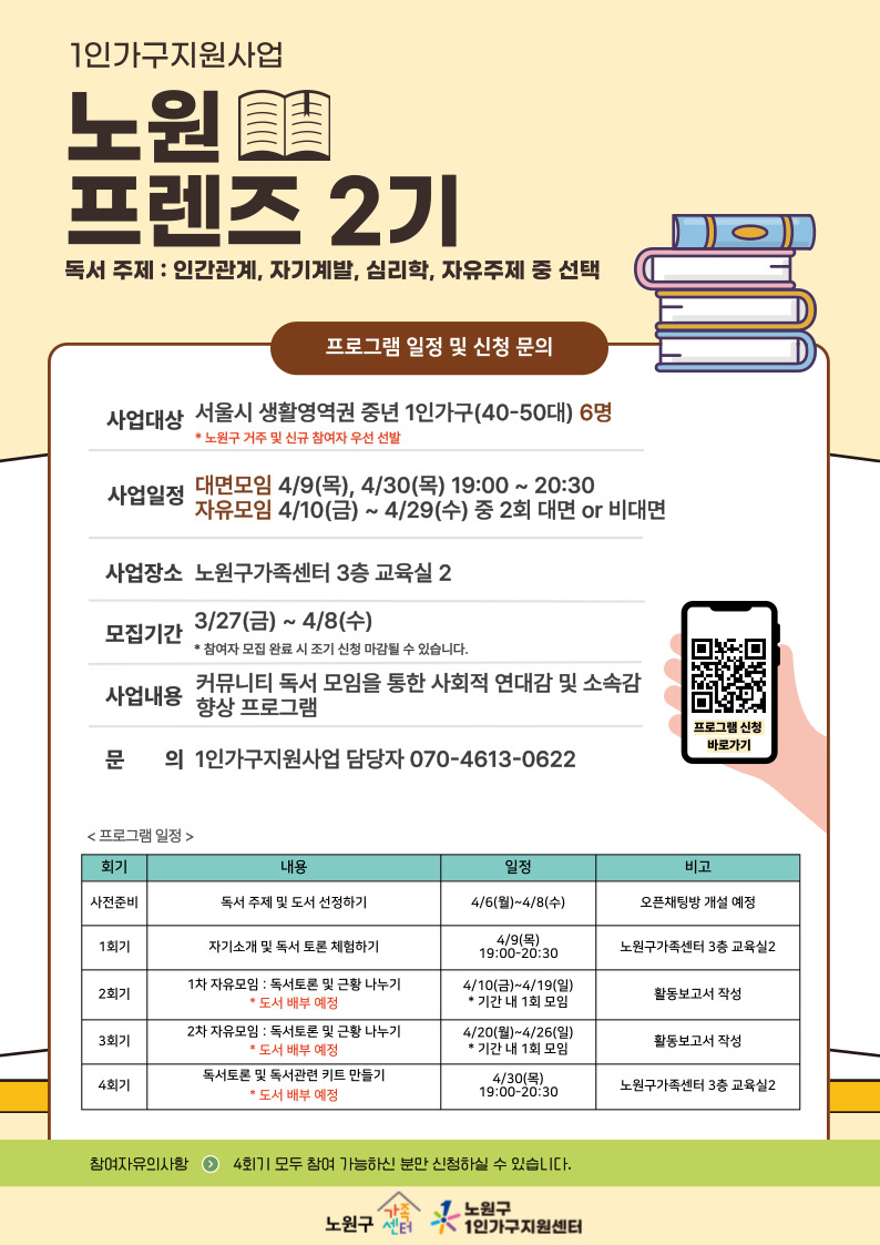 - 노원구[노원구] 1인가구 독서커뮤니티 프로그램 '노원프렌즈 2기' 참여자 모집 중