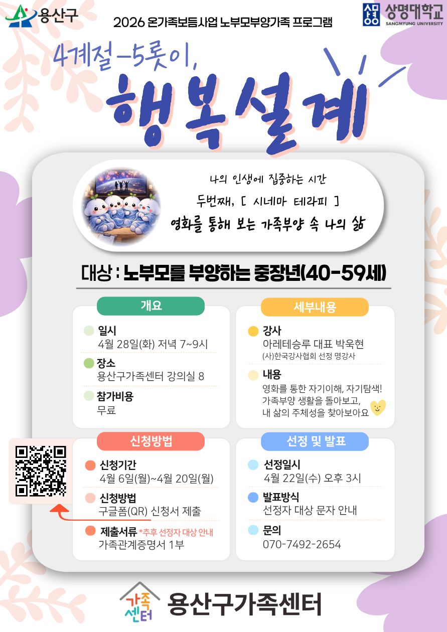 [용산구] 노부모부양 중장년 프로그램 '4계절-5롯이 행복설계'(시네마테라피) 참여자 모집