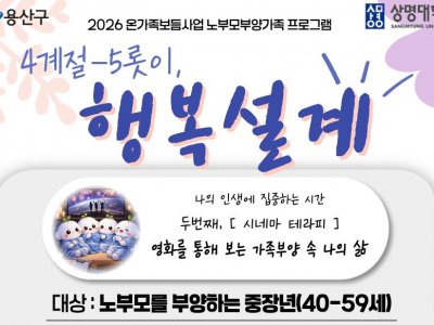 - 용산구[용산구] 노부모부양 중장년 프로그램 '4계절-5롯이 행복설계'(시네마테라피) 참여자 모집