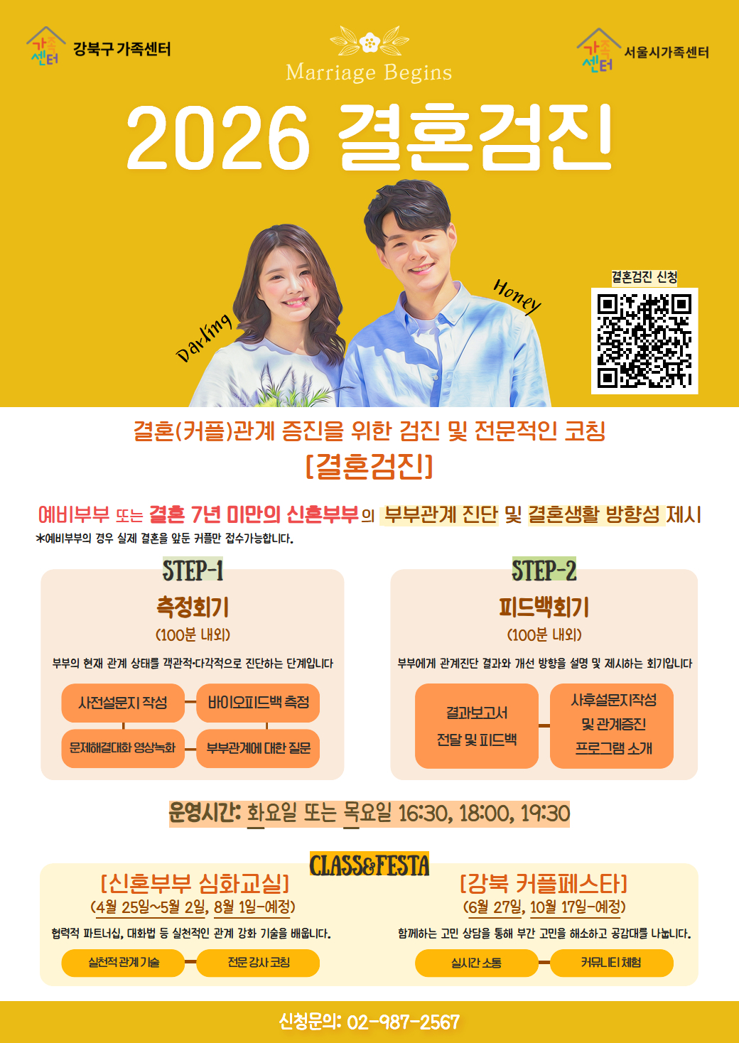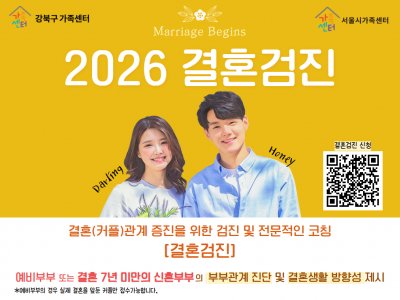 ☞ 강북구가족센터 결혼검진 문의전화: 02-987-2567(내선2번) 또는 070-7462-1997 가족관계지원파트