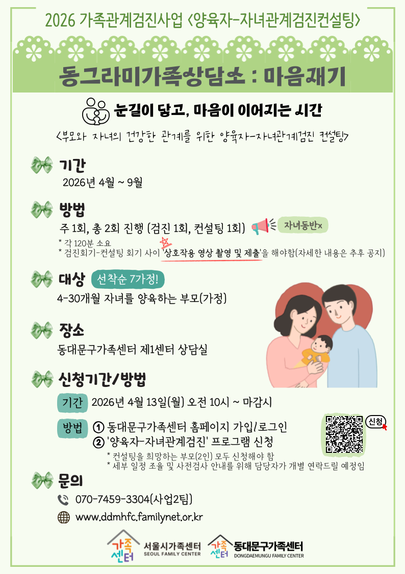 > 신청방법 : 동대문구가족센터 홈페이지 가입 → '양육자-자녀관계검진' 신청