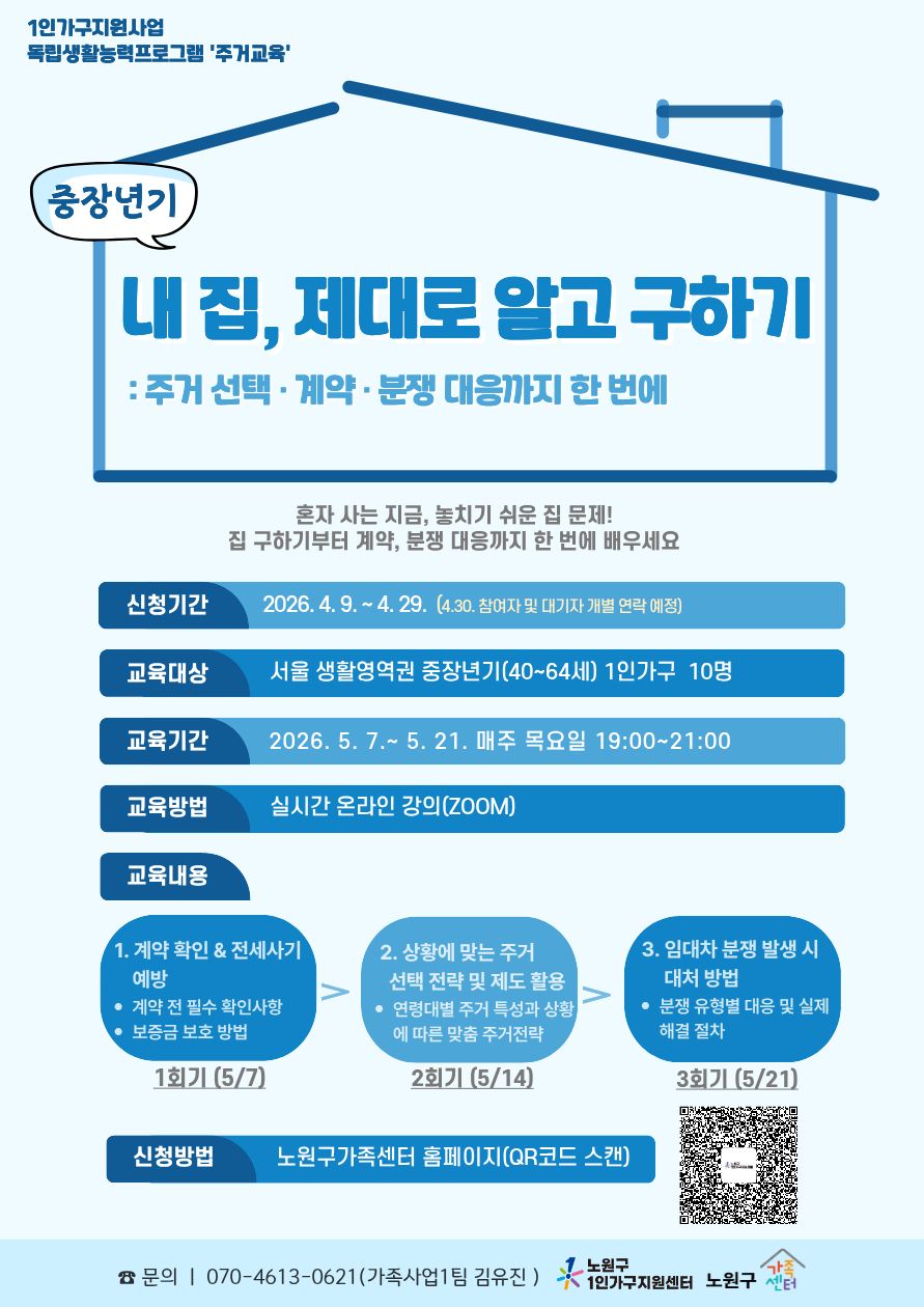 - 노원구[노원구] 2026 1인가구 독립생활능력프로그램 "중장년기-내 집, 제대로 알고 구하기"