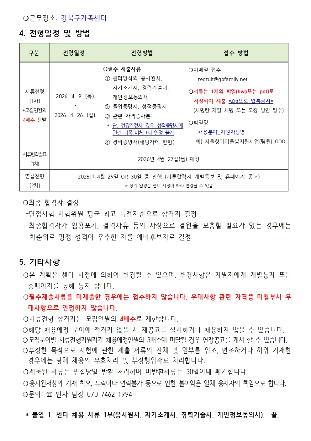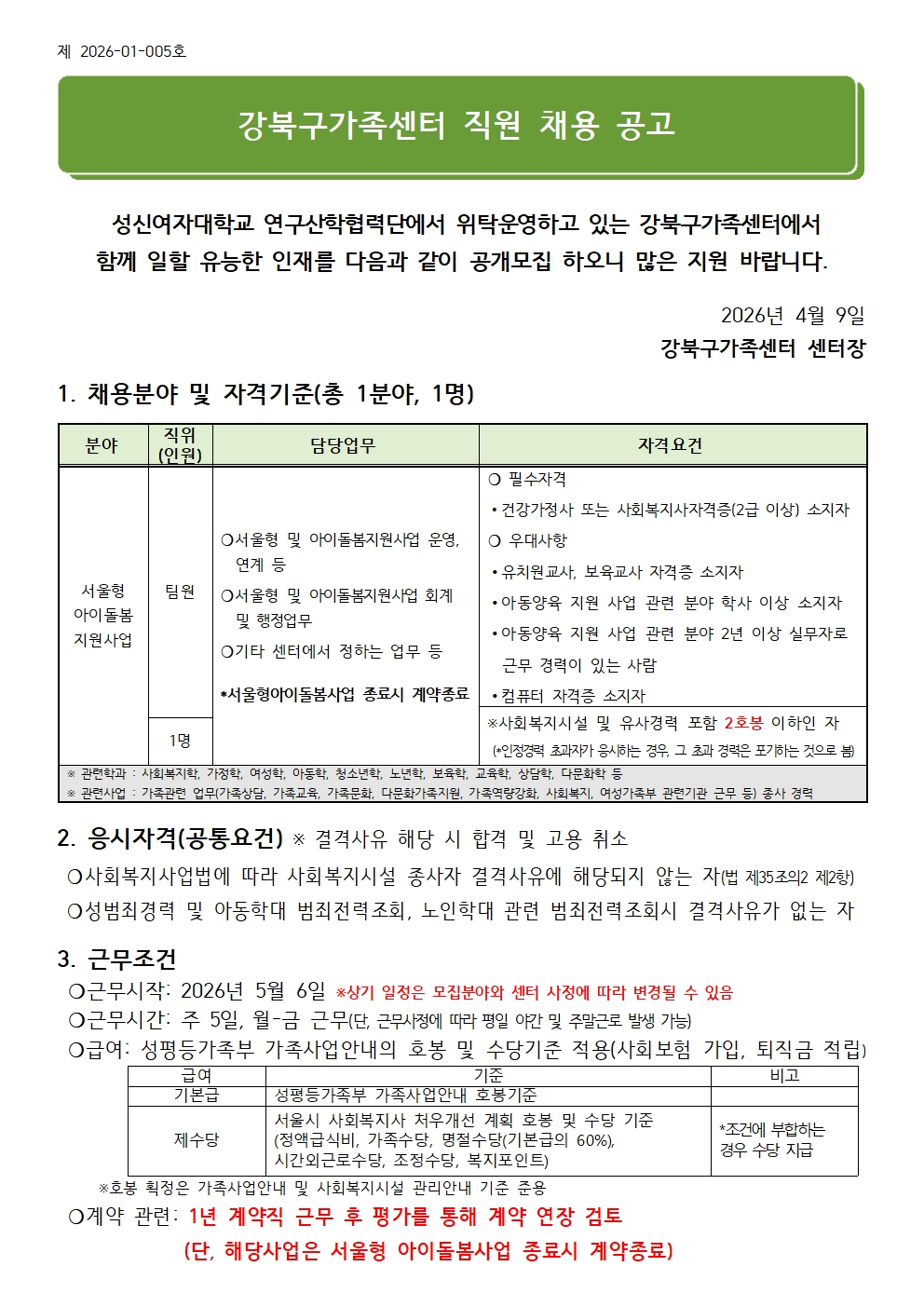 (제2026-01-005호) 2026년 강북구가족센터 직원 채용 공고
