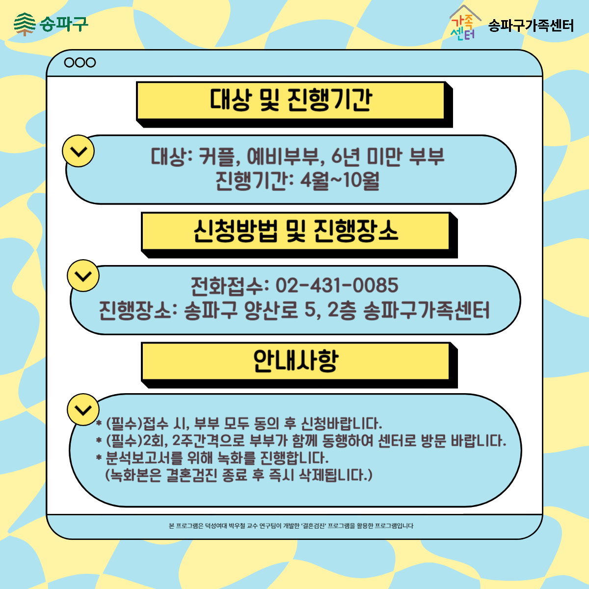 - 커플, 예비부부, 6년미만 부부 송파구가족센터 1센터(송파구 양산로 5, 2층)