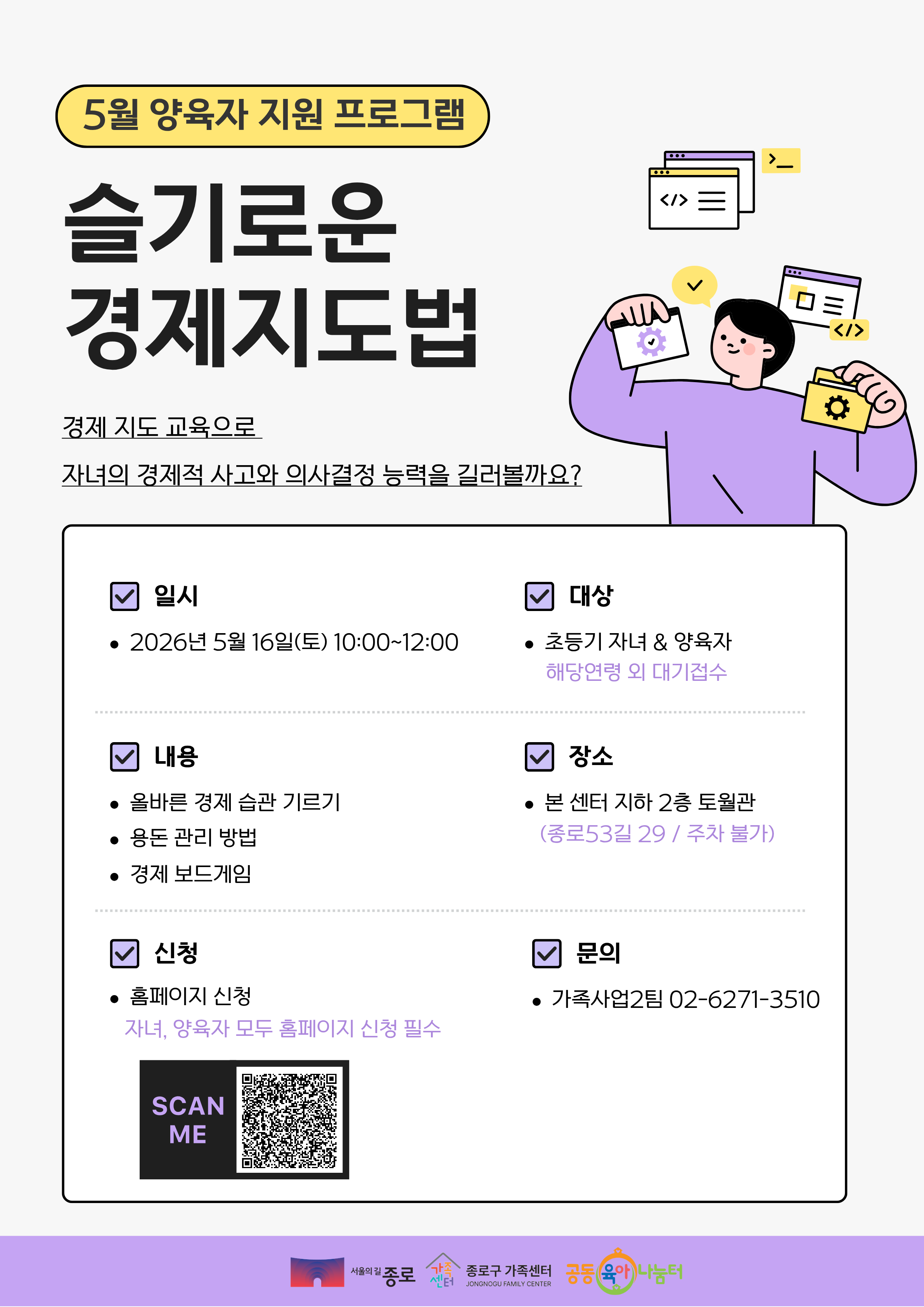 - 종로구[종로구] 5월 양육자 지원 프로그램 '슬기로운 경제지도법' 참여자 모집