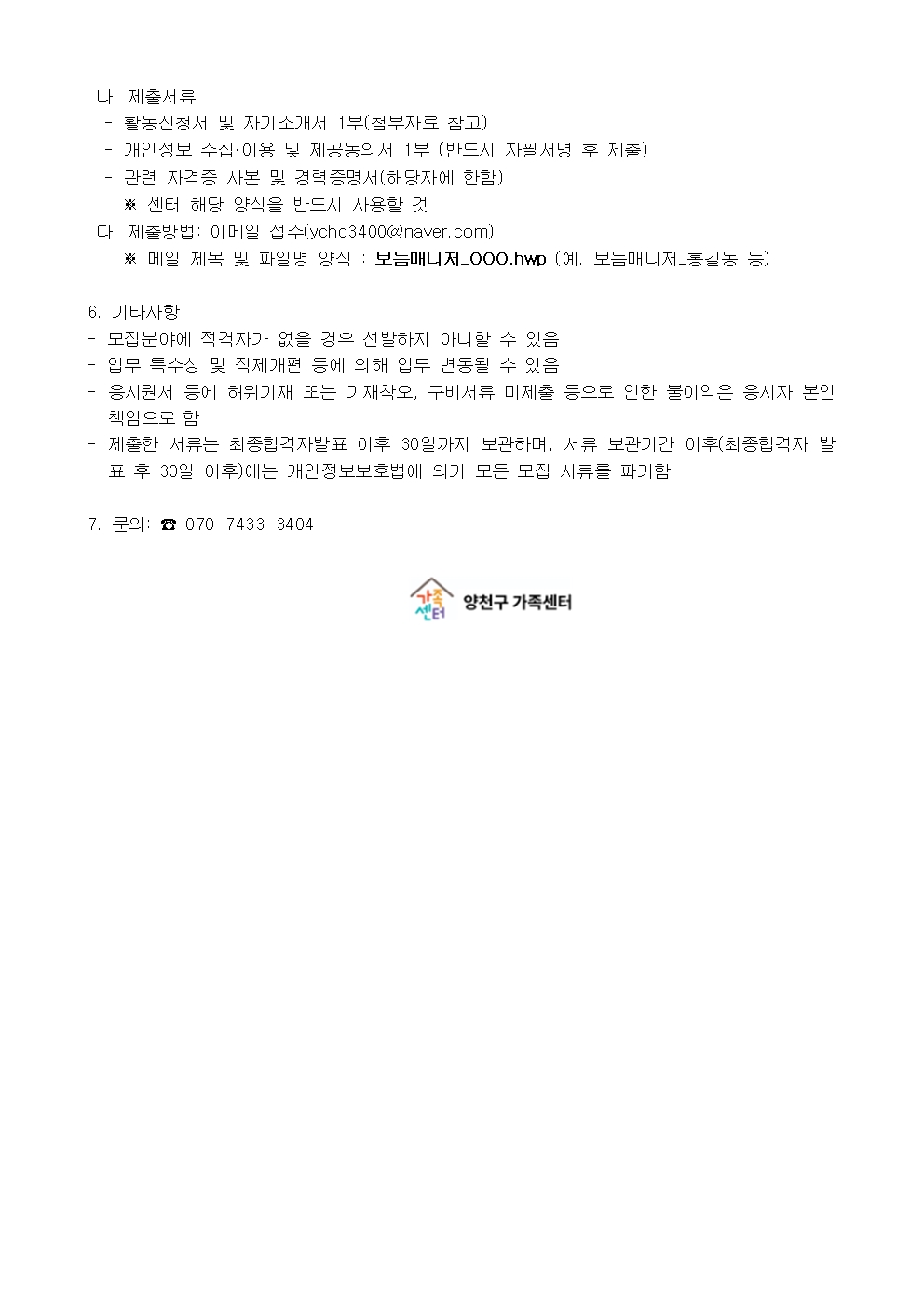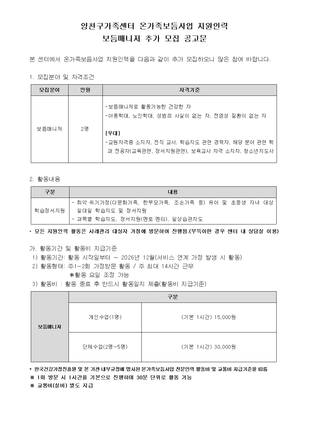 2026년 양천구가족센터 온가족보듬사업 지원인력(보듬매니저) 추가모집공고(제2026-4호).hwp
