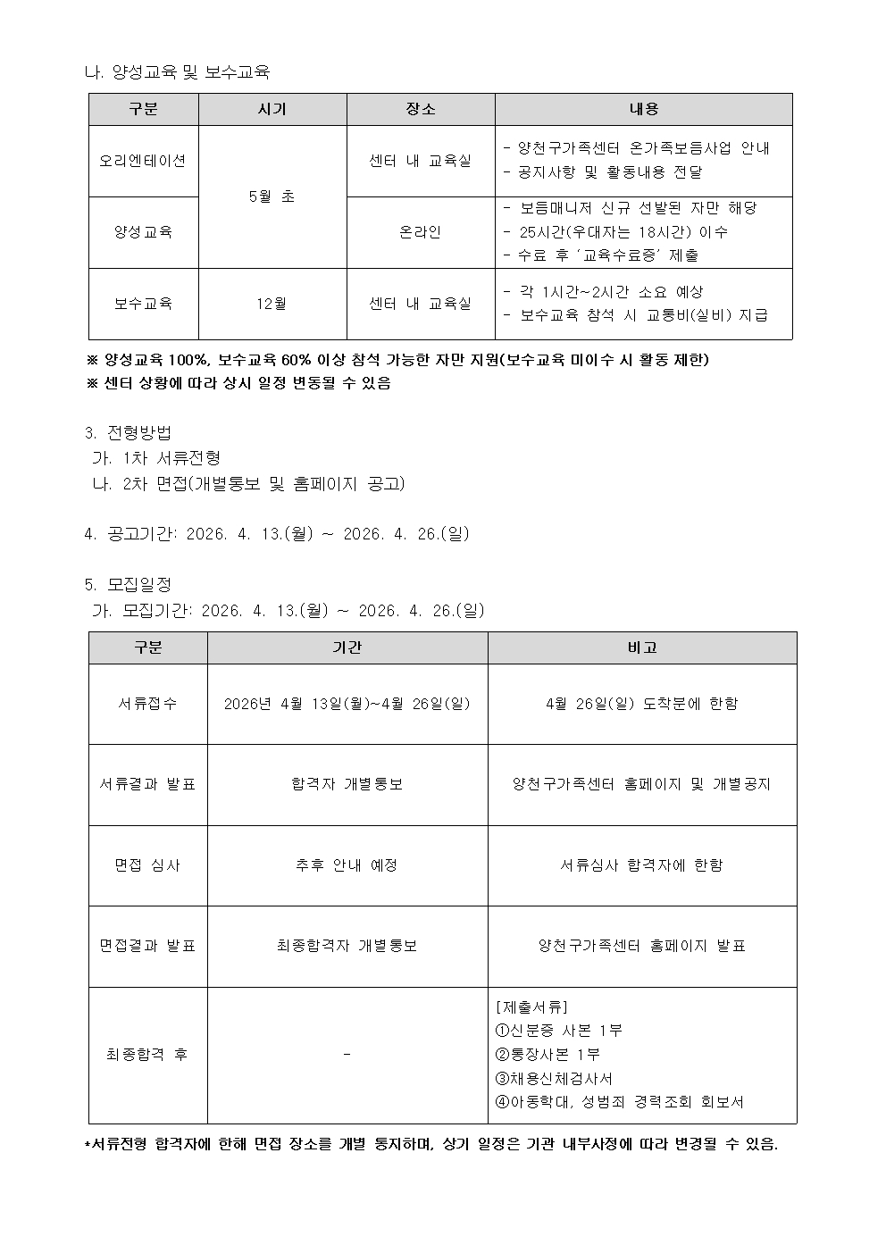 2026년 양천구가족센터 온가족보듬사업 지원인력(보듬매니저) 추가 모집 공고(제2026-04호)