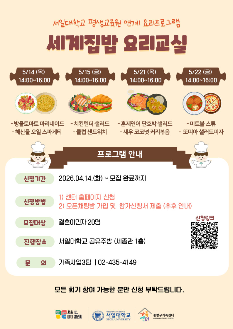 ‘세계집밥 요리교실’ 참여자를 모집하오니, 많은 관심과 신청 부탁드립니다.