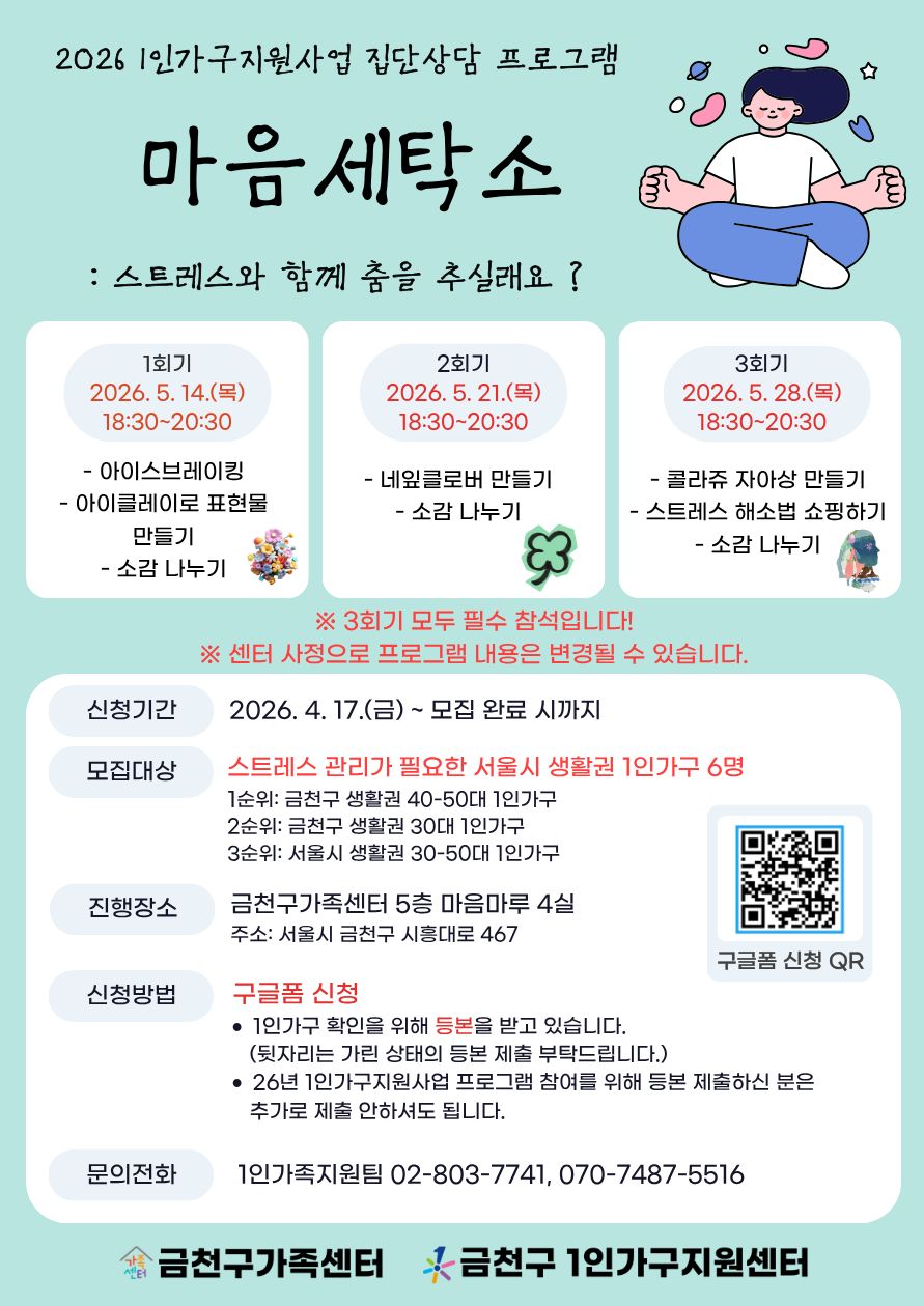♥문의/신청: 금천구가족센터 1인가구지원팀 (02-803-7741, 070-7487-5516)