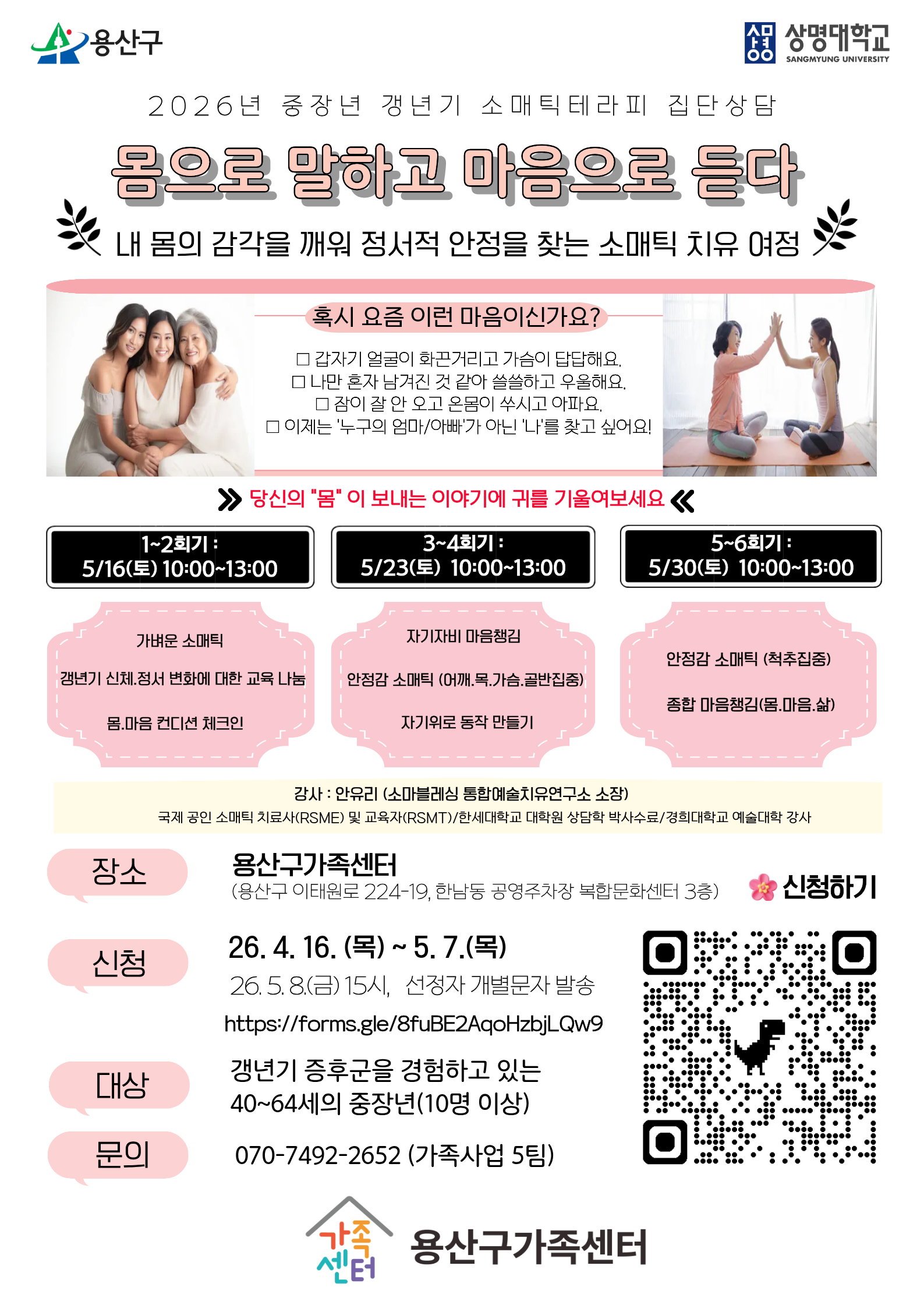 [용산구] 중장년 갱년기 소매틱테라피 집단상담 "몸으로 말하고 마음으로 듣다"