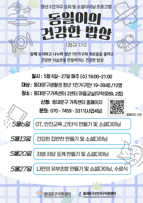 - 서울시 생활권 1인가구, 동대문구 지역 주민 동대문구가족센터 제2센터 교육장(무학로 89)
