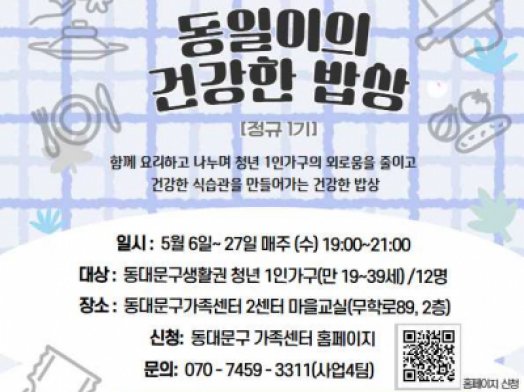 - 서울시 생활권 1인가구, 동대문구 지역 주민 동대문구가족센터 제2센터 교육장(무학로 89)