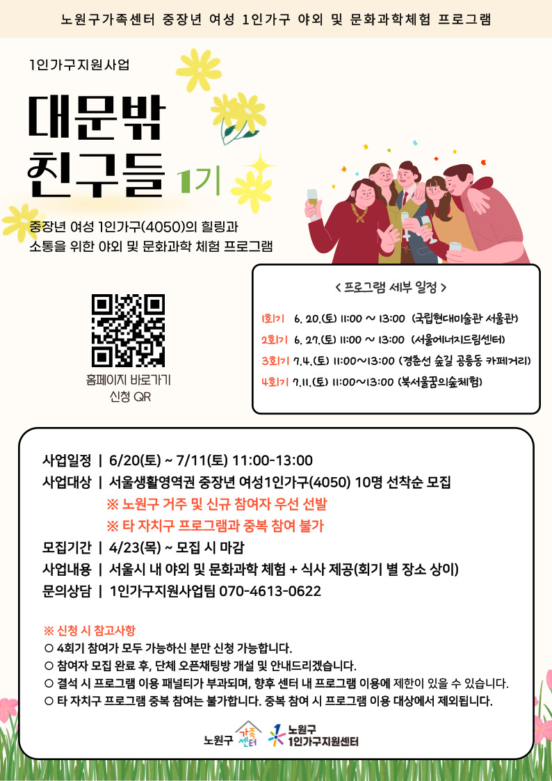 - 노원구[노원구] 1인가구지원사업_중장년 야외 및 문화과학 체험 프로그램 참여자 모집