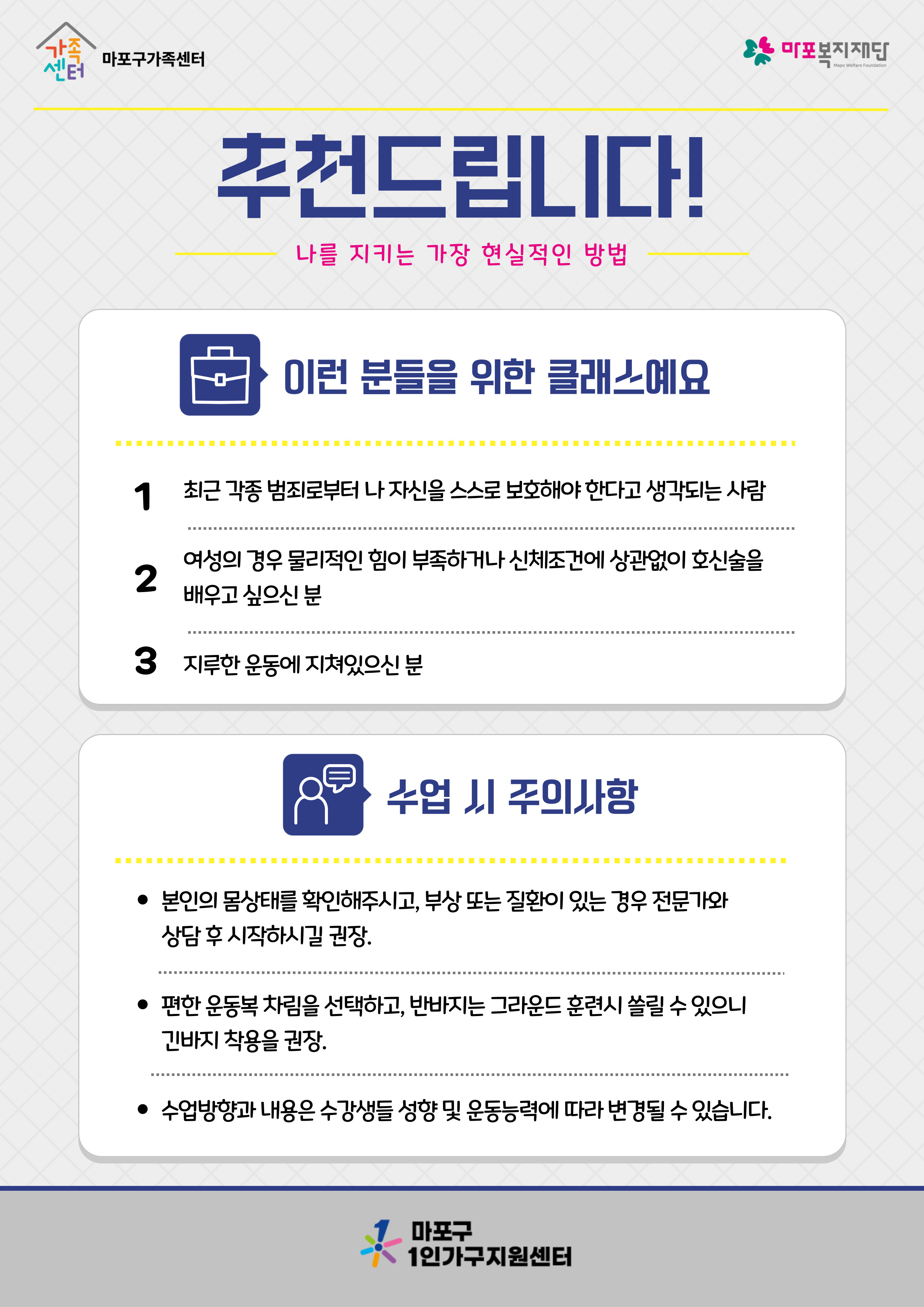 마포구가족센터에서 서울시 생활권 1인가구의 일상 속 안전을 위해 ‘셀프 디펜스’ 프로그램을 진행합니다.
