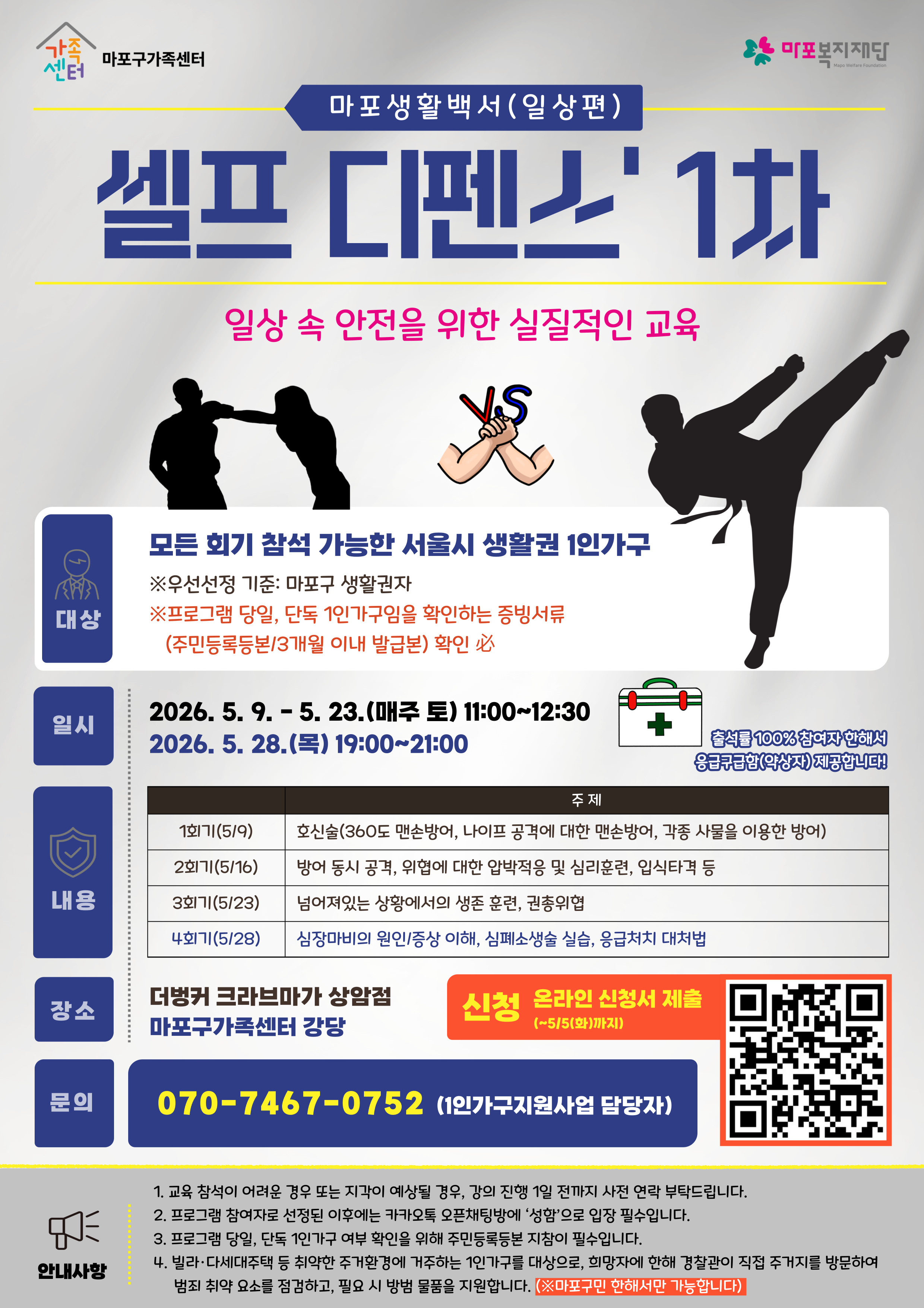 문의 ☎ 070-7467-0752 (마포구 1인가구지원센터 담당자), 1:1문의방 https://open.kakao.com/o/sveWRkoi