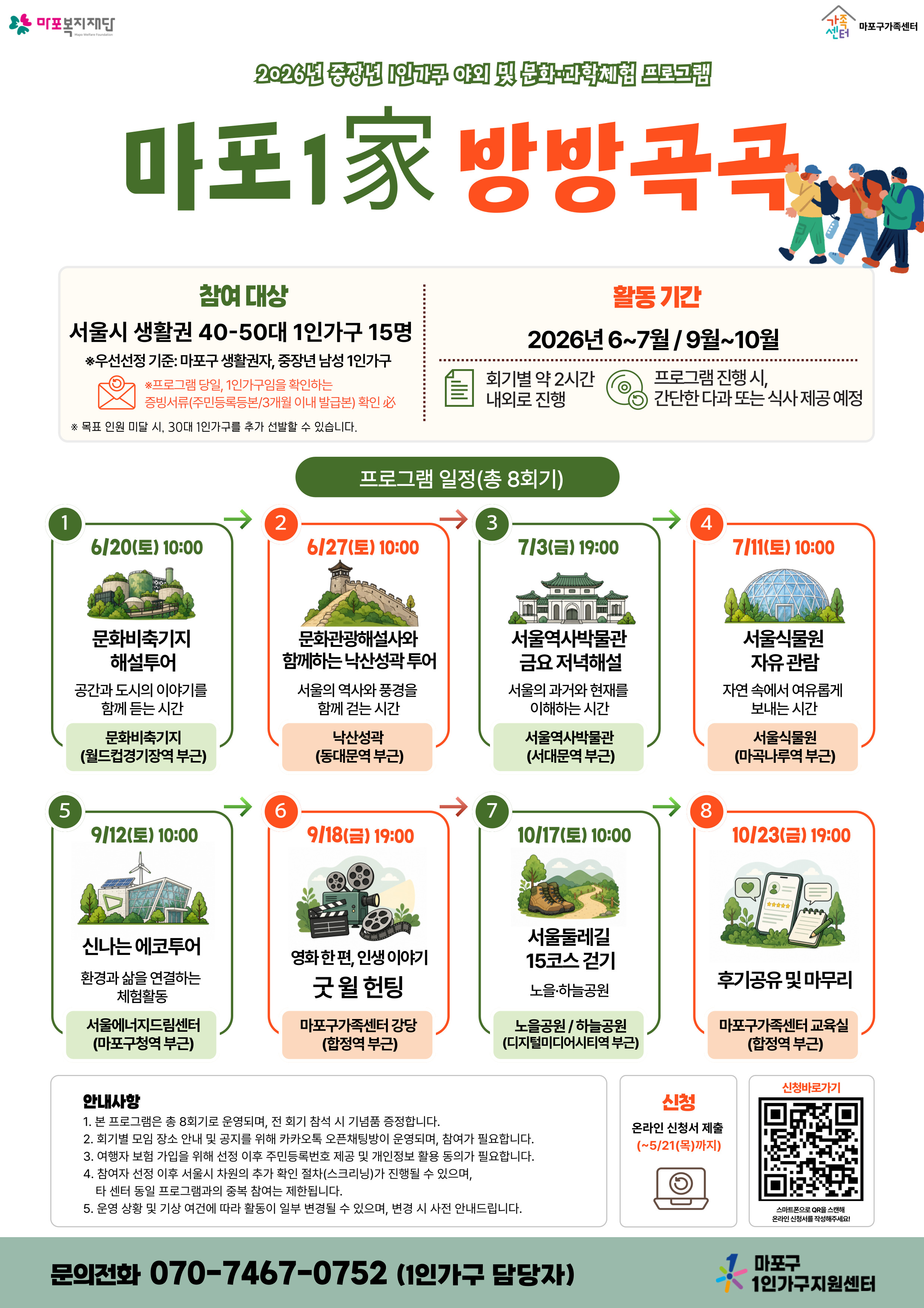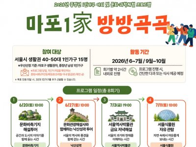 - 마포구[마포구] 중장년 1인가구 야외 및 문화과학 체험 프로그램 '마포1家 방방곡곡' 참여자 모집