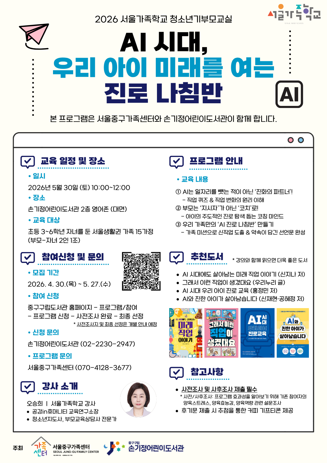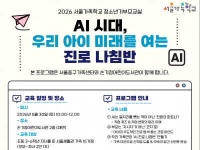 급변하는 AI 시대, 우리 아이의 진로가 고민이신가요? 서울중구가족센터와 손기정어린이도서관이 함께 준비한 ‘2026 서울가족학교 청소년기 부모교실’에 초대합니다!