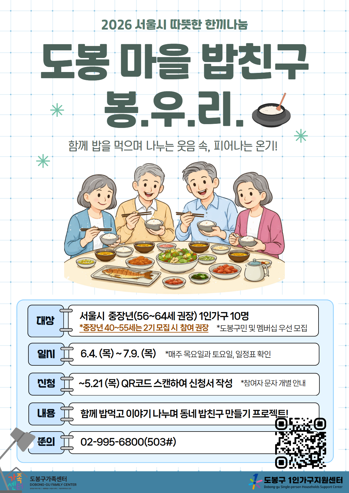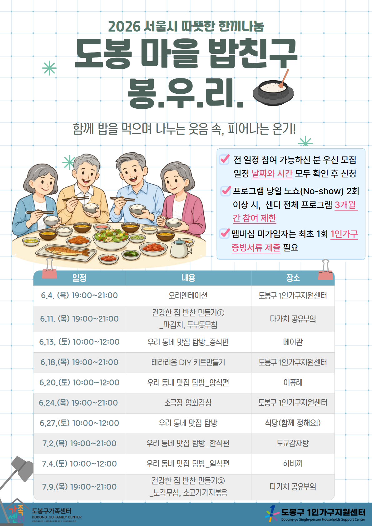 - 도봉구[도봉구] 중장년 1인가구 따뜻한 한끼나눔 '도봉구 마을 밥친구 봉.우.리' 참여자 모집 중