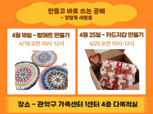 - 관악구[관악구] 1인가구 중노년 취미교실_「만들고 바로 쓰는 공예」 모집중!