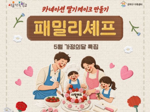 함께 배워요, 식탁 위 수다를 맛있게 할 소통레시피! 아이들의 몰랐던 모습, 아빠의 숨겨진 요리실력을 발견할 수 있는 기회! 온 가족이 모이는 관악구 [패밀리셰프]와 함께하세요.