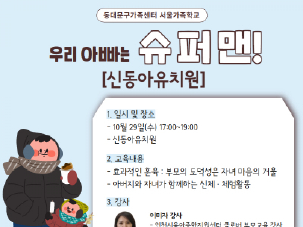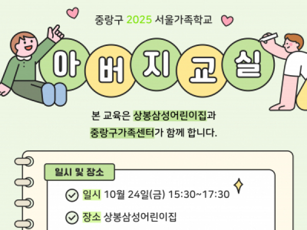 [중랑구] 아버지교실 (with 상봉삼성어린이집) 2025.10.02 [중랑구가족센터] 아버지교실 (with 상봉삼성어린이집) - 일시: 10월 24일 (금) 15:30~17:30 - 장소: 상봉삼성어린이집 - 내용: 자녀와의 친밀감과 안정적 애착관계 / 아빠와 자녀가 함께하는 신체놀이 활동 - 문의: 02-435-4142 * 본 교육은 상봉삼성어린이집과 함께하는 교육으로 참여자 모집이 완료되었습니다.